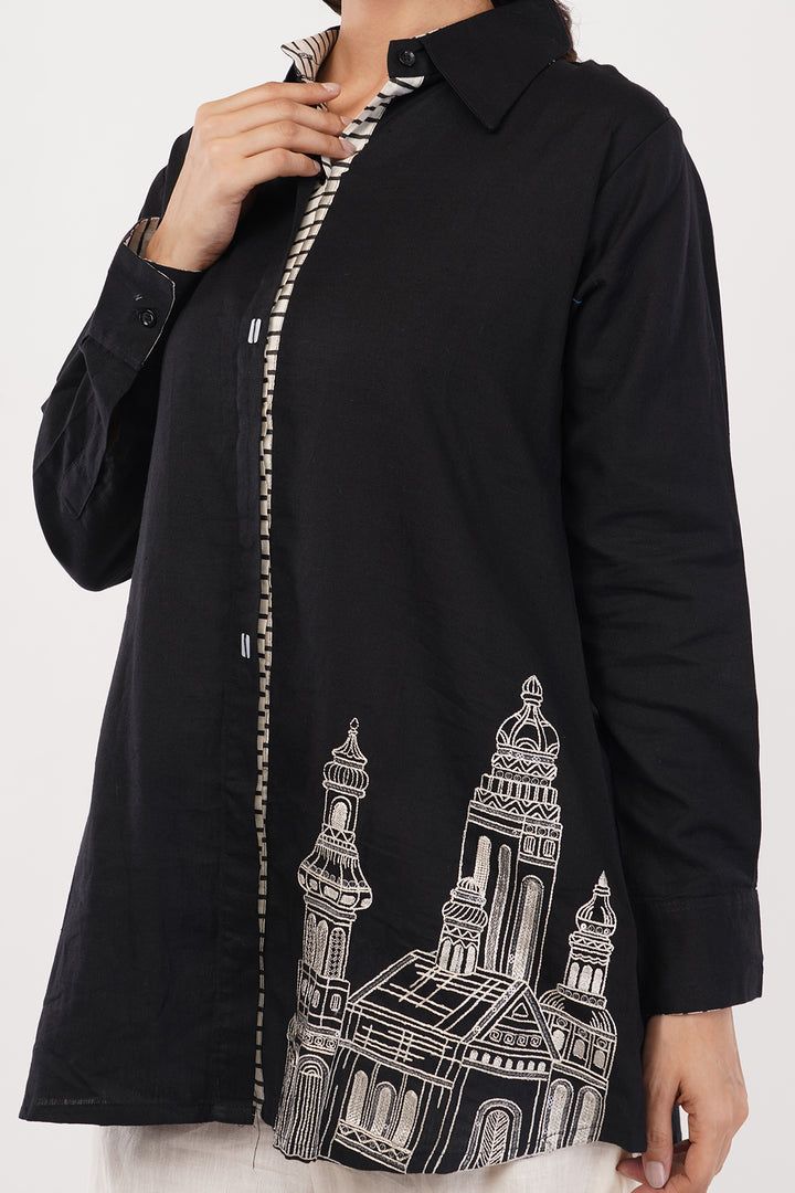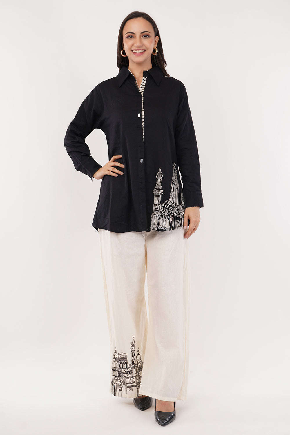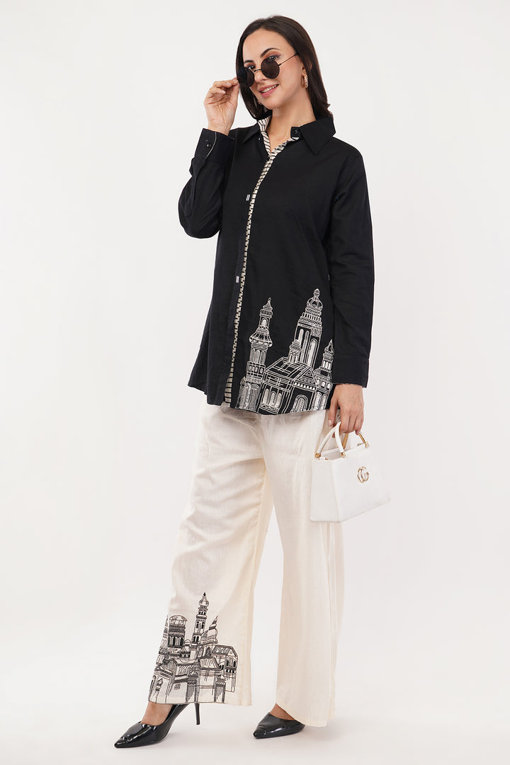 Linen cotton balck and white shirt and pant set with hand embroidery on the pants and shirt