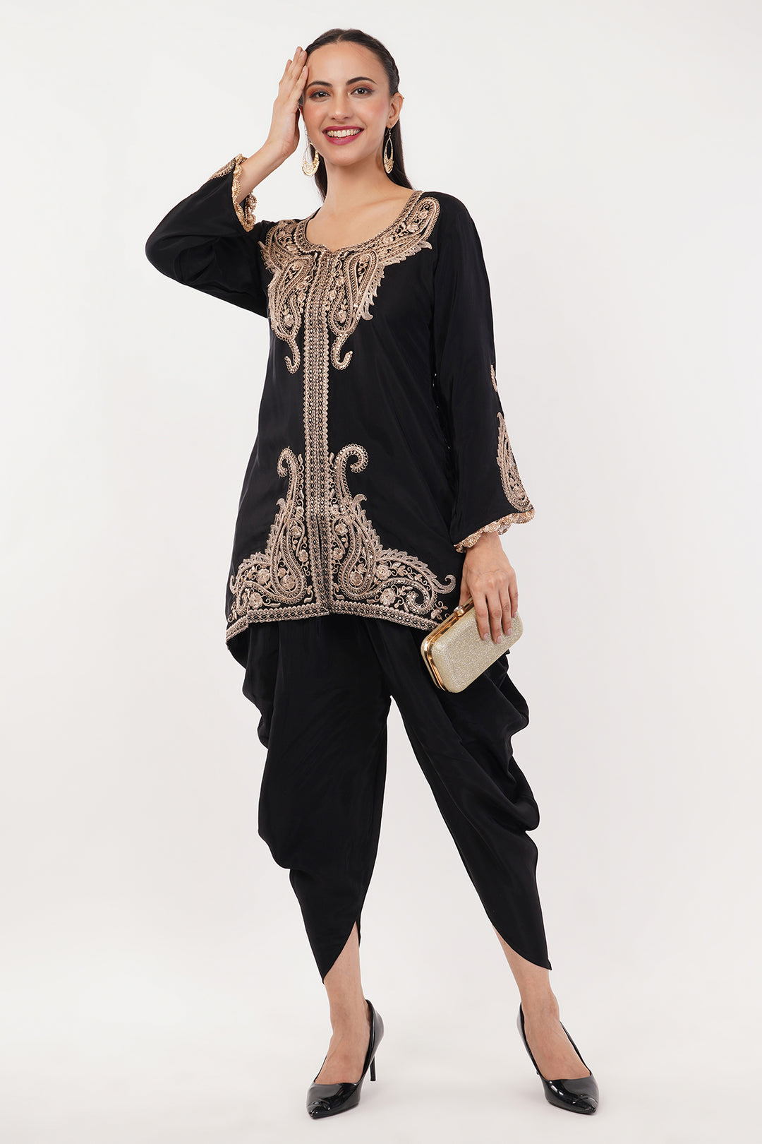 Pure crepe Black and Gold kashmiri work short kurta with tulip pants